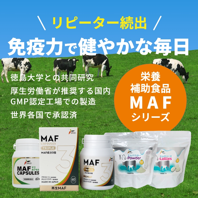 健康自然食品「MAFシリーズ」は、再生未来グループと徳島大学との共同研究により、10数年の歳月をかけて開発した世界初の健康自然食品です。